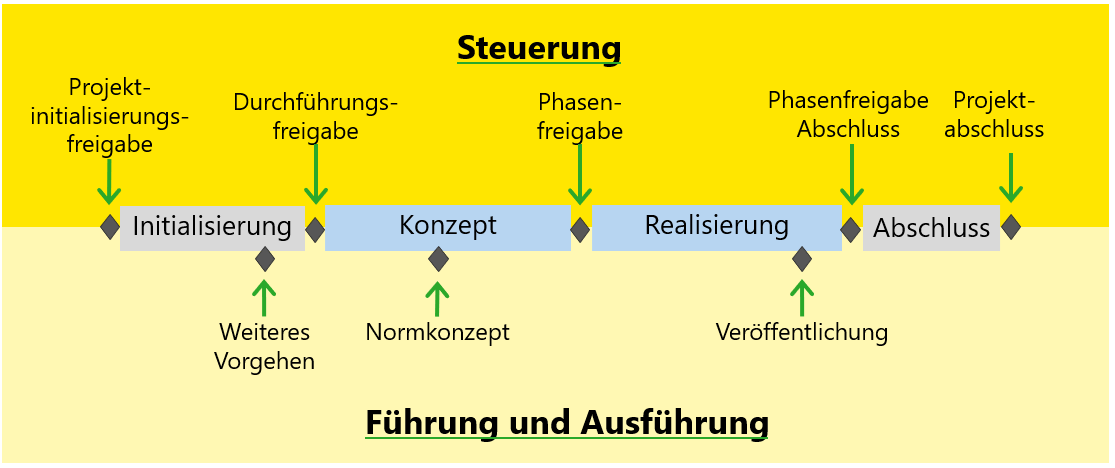 Die Steuerung eines Rechtsetzungsprojekts erfolgt in Phasen. Die folgende Darstellung zeigt die Gliederung des Rechtsetzungsprojektes in die Phasen Initialisierung, Konzept, Realisierung und Abschluss.