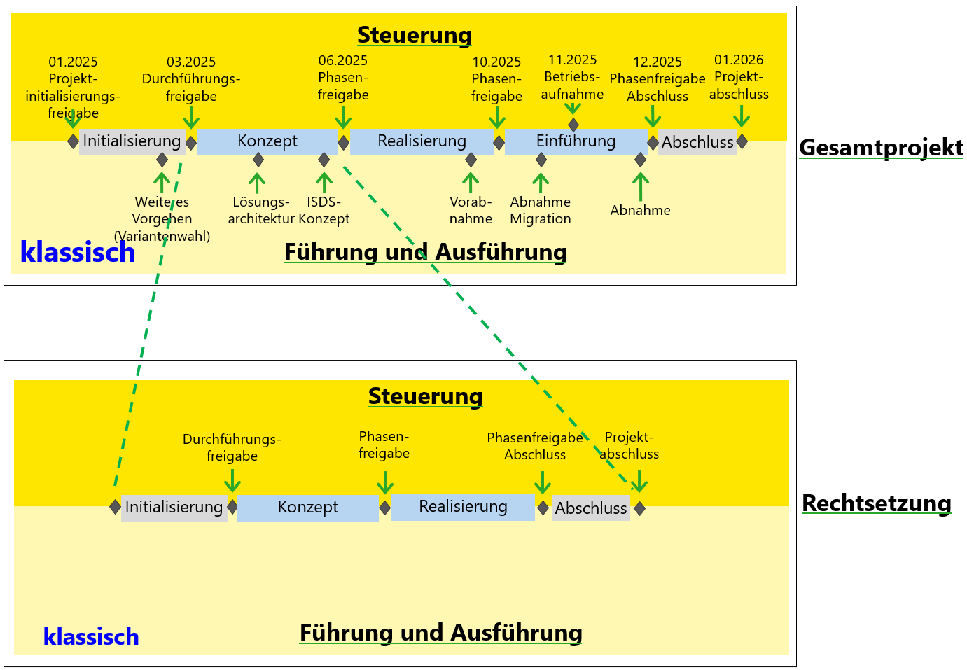 Ein Rechtsetzungsprojekt kann für sich allein stehen oder Teil eines Gesamtprojekts sein. Erfolgt die Umsetzung des neuen Rechts im Rahmen eines Gesamtprojekts, weist das Rechtsetzungsprojekt keine Phase Einführung auf. Steht das Rechtsetzungsprojekt für sich alleine, wird die Einführungsphase in einem eigenen Projekt abgewickelt. Die Einführungsphase ist deshalb nicht Teil dieses Leitfadens.