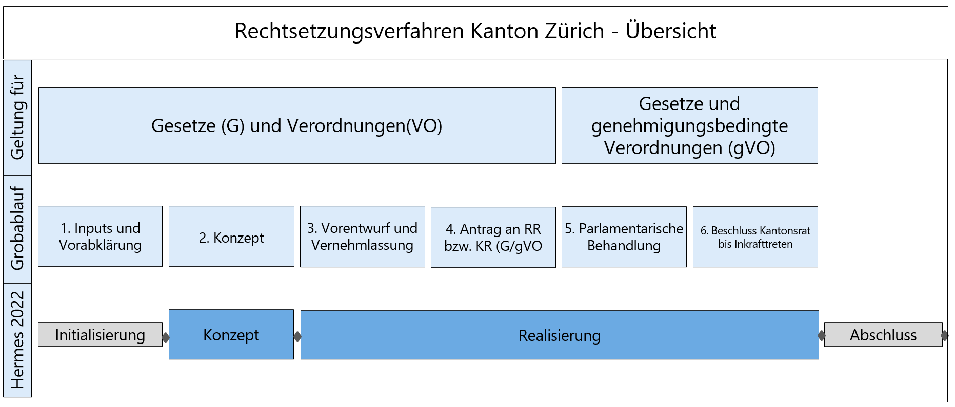 Die Darstellung verbindet das Rechtsetzungsverfahren des Kantons Zürich («Grobablauf») mit den Phasen gemäss «HERMES 2022» und bestimmt den Geltungsbereich je nach Normstufe («Geltung für»).